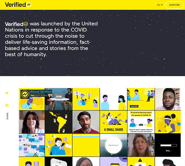 VERIFIED平台是团结国为应对新冠肺炎疫情而提倡,,,,,,,,旨在改善获得准确信息的途径。。。。。。团结国试图组织一个由数百万在线自愿者组成的网络,,,,,,,,在庞杂的信息中提供有关新冠疫情的科学信息,,,,,,,,并分享真实而优美的抗疫故事。。。。。。