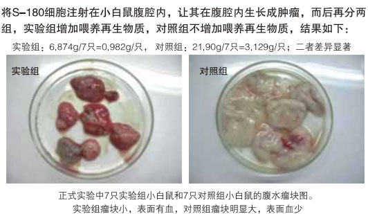 ½«S-180ϸ°û£¬£¬£¬£¬£¬×¢É䵽С°×Êó¸¹Ç»ÄÚ£¬£¬£¬£¬£¬ÈÃÆäÔÚ¸¹Ç»ÄÚÐγÉÖ×Áö×éÖ¯£¬£¬£¬£¬£¬ÔÚÐγÉÒ»¶¨¾Þϸʱ·ÖΪÁ½×飬£¬£¬£¬£¬Ò»×éÔöÌíÒ»¶¨Á¿ÔÙÉúÎïÖʵÄÎ¹Ñø(ʵÑé×é)£¬£¬£¬£¬£¬Ò»×é²»¼ÓÔÙÉúÎïÖÊÎ¹Ñø(±ÈÕÕ×é)¡£¡£ ¡£¡£ ¡£¡£Ò»¶Îʱ¼äºó£¬£¬£¬£¬£¬½«Ð¡°×Êó¸¹Ç»ÄÚµÄÖ×Áö×é֯ȡ³ö£¬£¬£¬£¬£¬¾ÙÐгÆÁ¿£¬£¬£¬£¬£¬Î¹ÑøÔÙÉúÎïÖÊ×éµÄС°×ÊóÖ×Áö×éÖ¯¿éÏÔ×ŵØÐ¡ÓÚûÓÐÎ¹ÑøÔÙÉúÎïÖÊ×éС°×Êó¸¹Ç»ÄÚµÄÖ×Áö×éÖ¯¿é£¬£¬£¬£¬£¬Êý¾ÝÊÇ£ºÊµÑé×é0.982g/Ö»£¬£¬£¬£¬£¬±ÈÕÕ×é3.12g/Ö»£¬£¬£¬£¬£¬ÇÒÖ×Áö×éÖ¯µÄÑÕÉ«Íâ¹ÛÏÔ×Ųî±ð¡£¡£ ¡£¡£ ¡£¡£