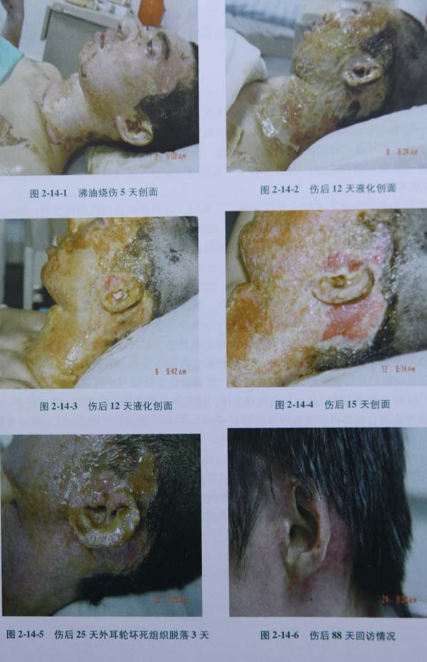 2141沸油燃烧致颜面部烧伤后5天,,,,,,,耳部逐渐泛起液化,,,,,,,耳廓外轮蜡黄色,,,,,,,仍毗连细密,,,,,,,不急于扫除;;; ;;;图2142、图2143烧伤后12天,,,,,,,耳廓周围坏死头皮液化扫除,,,,,,,肉芽新鲜,,,,,,,耳廓液化佳,,,,,,,但毗连仍细密,,,,,,,换药时仅扫除液化物、多余药物、松动坏死组织;;; ;;;图2144烧伤后15天,,,,,,,外耳轮坏死组织浮起,,,,,,,但边沿仍细密毗连;;; ;;;图2145烧伤后25天,,,,,,,外耳轮坏死组织脱落3天,,,,,,,肉芽生长佳,,,,,,,新鲜,,,,,,,继续通例治疗;;; ;;;图2146烧伤后88天,,,,,,,出院后回访,,,,,,,知足心理性愈合,,,,,,,一连zoty中欧体育疤痕平软膏治疗,,,,,,,形成薄层软疤 。。。。。。
