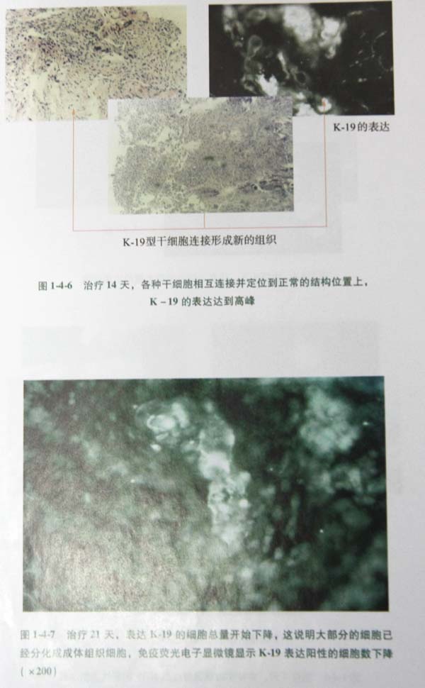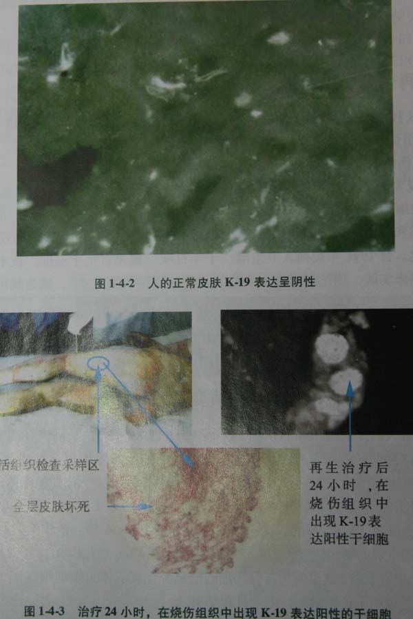 研究发明,, ,, ,正凡人的皮肤组织并不保存皮肤干细胞,, ,, ,即K19表达呈阴性(图142)。。。。 。。但在烧伤之后,, ,, ,若是接受原位再生皮肤手艺治疗,, ,, ,烧伤创面的潜能细胞将爆发纪律性转变。。。。 。。临床研究发明,, ,, ,深度烧伤创面经由再外行艺治疗24小时,, ,, ,烧伤组织中泛起了K19表达阳性的细胞(图143);;;;;;;治疗4天,, ,, ,在皮下组织泛起大宗的扩增细胞(K19表达阳性的细胞,, ,, ,图144);;;;;;;当治疗至第7天,, ,, ,有多种功效的多种扩增细胞形成,, ,, ,且K19的表达的细胞抵达岑岭(图145);;;;;;;治疗至第14天,, ,, ,种种干细胞相互毗连,, ,, ,并定位到正常的结构位置上,, ,, ,K19的表抵达最岑岭点(图146)。。。。 。。治疗后21天,, ,, ,表达阳性的K19细胞总量最先下降, 这说明大部分的细胞已经分解成成体组织细胞(图147)。。。。 。。烧伤后28天,, ,, ,K19表达消逝,, ,, ,说明干细胞消逝,, ,, ,再生历程竣事。。。。 。。