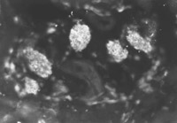 用特异的小鼠抗人角卵白19型的单克隆抗体(McAb)对正常和烧伤皮肤免疫细胞化学视察效果批注,,,,,,两例正常皮肤表皮再生干细胞数目较少,,,,,,可见少量显示荧光的表皮细胞再生干细胞(图5-4-1),,,,,,即角卵白19型阳性细胞。。。。。烧伤后24h,,,,,,荧鲜明微镜下,,,,,,显示荧光的表皮再生干细胞数目中等水平(图5-4-2),,,,,,烧伤后4天,,,,,,在汗腺、毛细血管和毛囊周围可见最先增多的潜在表皮干细胞(图5-4-3)。。。。。