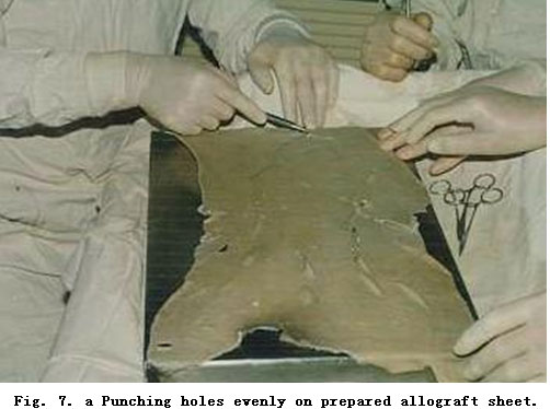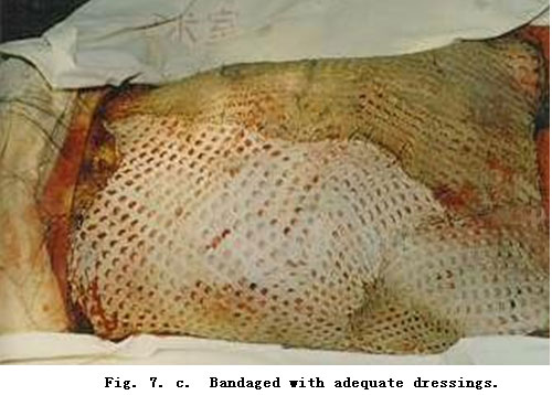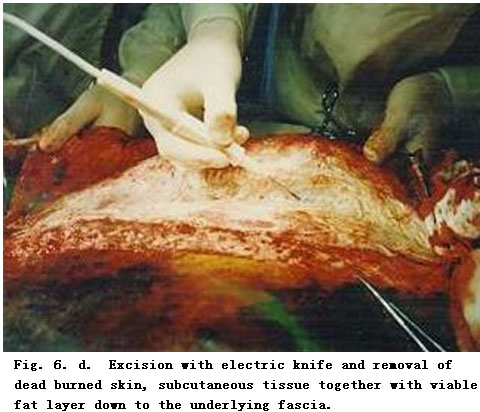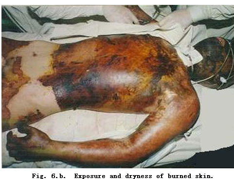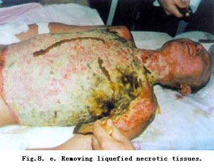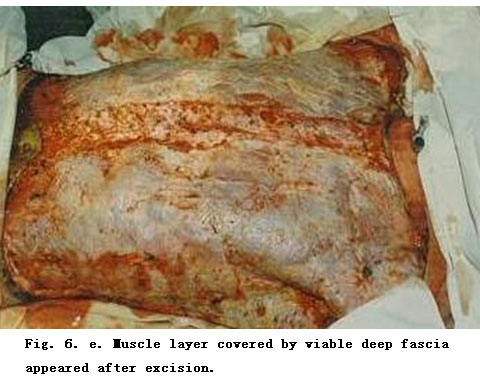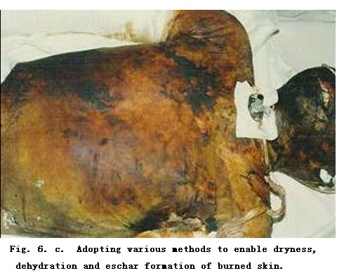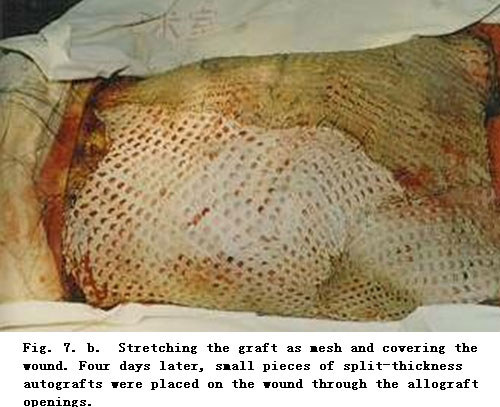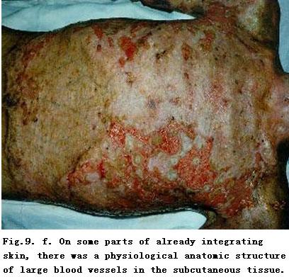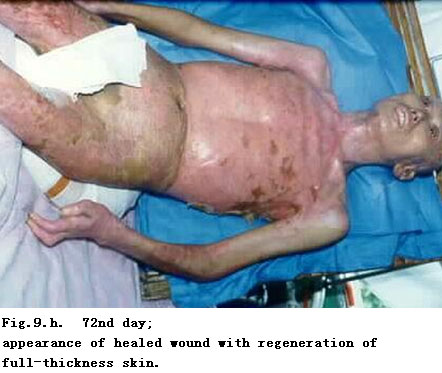 On admission, rapid fluid resuscitation was started to correct shock and tracheotomy was performed to improve ventilation. Escharectomy was then performed on the third-degree wounds of the left forearm and both legs to relieve pressure and improve blood circulation at the extremities. Superior vena cava puncturing and right cardiac floating catheterization were performed to monitor heart function. On day 2 postburn, surgical eschar excision to the underlying fascia and micro-particle autografting was performed on the extremities. On day 6, the patient received eschar excisions on the chest and abdomen, on which evenly holed allograft sheets were applied. Four days after the operation (day 10 postburn) small pieces of split-thickness autografts were placed on these wounds through the openings of the allograft. The patient developed severe Pseudomonas septicemia, and became comatose with low body temperature for 1 week. Septicemia was well controlled after intensive care. After that, repeated skin grafting was performed 9 times and most of the wounds healed. On day 43 postburn, corneal ulcer in the left eye occurred and was treated with eye drops and retrobulbar injection. Corresponding measures were taken to prevent stress ulcer, control infection and prevent pulmonary complications. The length of hospitalization was 70 days.