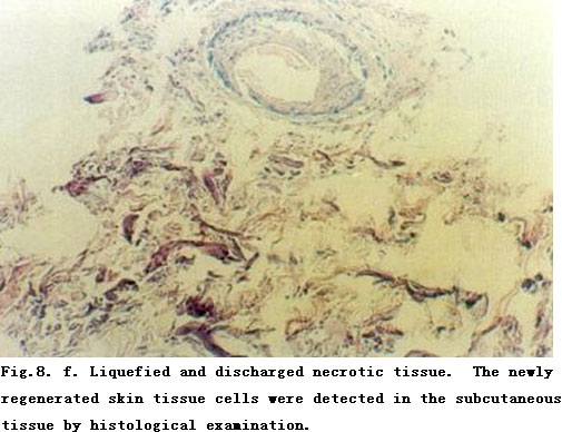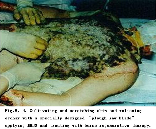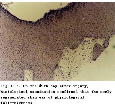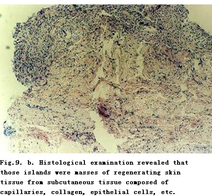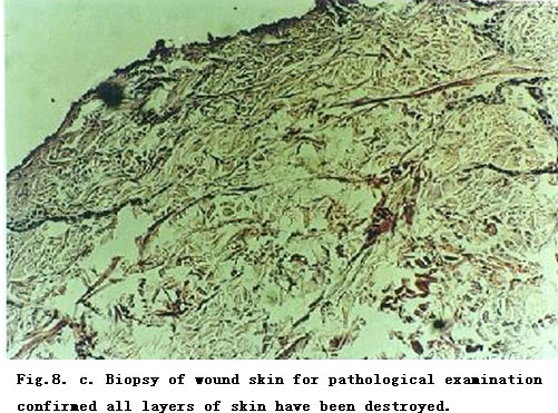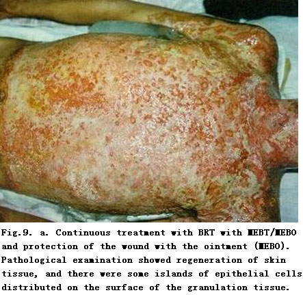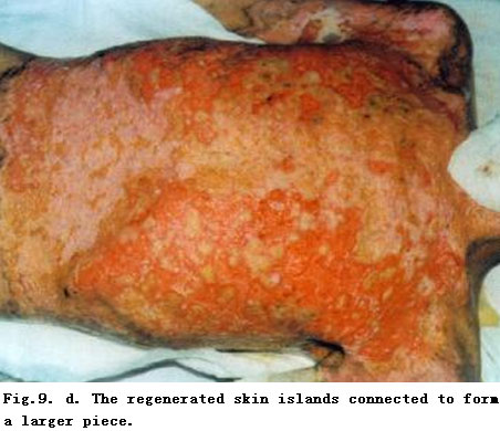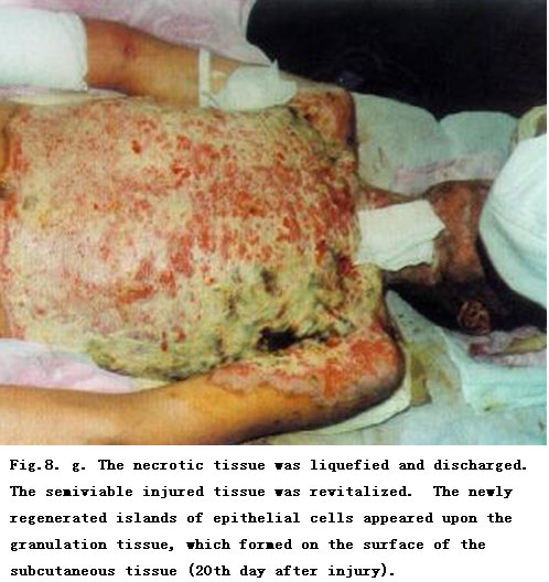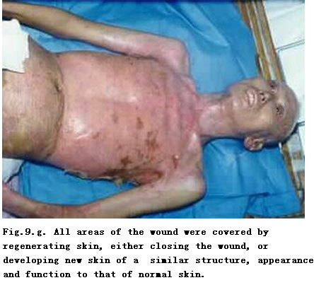 On admission, the patient was in a critical state and in shock. The extensive deep burns wounds were covered by cement powder. He had inhaled cement and his nasal hairs were singed. He suffered from respiratory abnormality and hoarseness. Tracheotomy was performed immediately. BRT with MEBT/MEBO treatment and cultivating technique was started on the wound and systemic comprehensive management begun. Histological examination of the wound skin showed third-degree burns. On day 30 postburn, liquefaction and discharge of wound necrotic tissues were finished. On day 49 postburn, newly regenerated skin was present on the wounds. Ten days later large sections of regenerated skin appeared on the wounds and all wounds had healed completely on day 72 postburn. One year later, follow-up showed the patient free of disablement, capable of independent viability and no need of reconstruction.