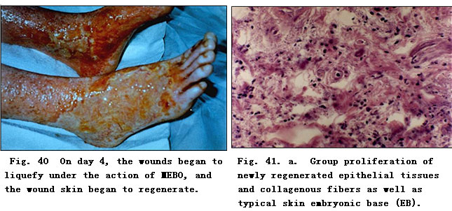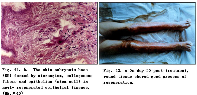 Repeat biopsy at the same burned location was performed for pathological examination.  The results showed massive granular tissues among the necrotic epithelial tissue,,,,,,,a proliferation of newly regenerated epithelial cells with collagenous fibers, as well as the typical skin embryonic base (EB, Fig. 41. a,b). After a 10-day application of MEBO, the comparably primitive epithelial tissues were observed under pathological examination of epithelial tissues sampled from the wound edge.