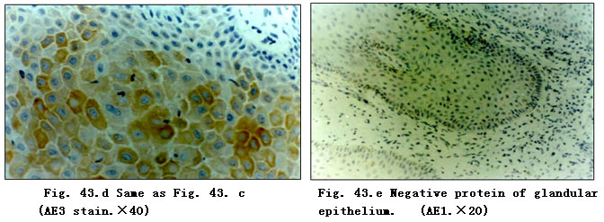 AE1 stain showed negative proteins of glandular epithelium, which is representative of glandular epithelium already transformed into squamous epithelium (Fig. 43. e).