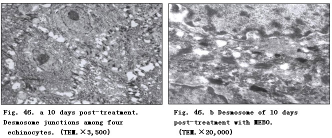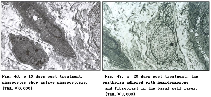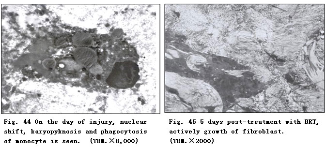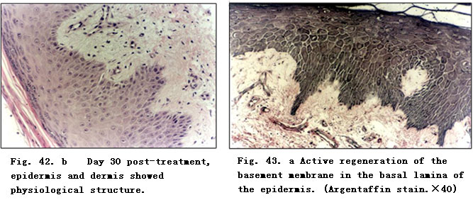 Twenty days post-treatment with BRT with MEBT/MEBO, wound tissue was examined and the results showed the clear appearance of collagenous fibers in epithelial tissue and subcutaneous tissue. Argentaffin stain indicated active regeneration of reticular fibers.  The reticular fibers around the small blood vessels of subcutaneous tissue appeared relatively normal. The basal cells of epidermis regenerated actively (Fig. 43. a,b).