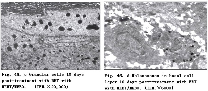 Ten days post-treatment with BRT with MEBT/MEBO, we noted the appearance in epidermis of echinocytes and desmosome in the stratum spinosum (Fig. 46. a, b), granular cells in stratum granulosum, and melanosomes in the basal cell layer (Fig. 46. c, d). We also observed phagocytes active around the small vessels, indicating recovery of function (Fig. 46. e).