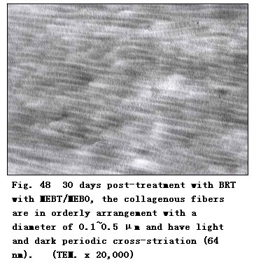 Thirty days post-treatment with BRT with MEBT/MEBO, with the regeneration and repairing of epithelium almost complete, collagenous fibers were mature with a diameter of 0.1~0.5 μm and arranged in an orderly fashion (Fig. 48). Light and dark periodic cross-striation (64 nm) was also observed. No pathomorphological changes of collagenous fibers such as distortion, helicoid (whirlpool) or cauliflower-like were observed.