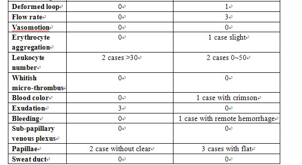 Observation Index: Appearance: vascular clearness, loop number, input branch, output branch, loop top diameter, loop length, percentages of crossed and deformed loops. Status of blood flow: flow rate, vasomotion, erythrocyte aggregation, leukocyte number, whitish micro-thrombus and blood color. Condition at the surroundings of the loops: exudation, bleeding, sub-papillary venous plexus, papillae and sweat duct.