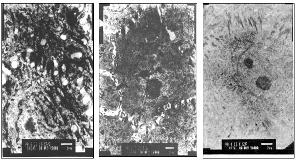 Fig.26. c (right). After MEBO treatment, structure of desmosome recovered to normal with uniform distribution of nuclear chromatin and regular cell shape with nucleolus in center. TEM. 5,000.