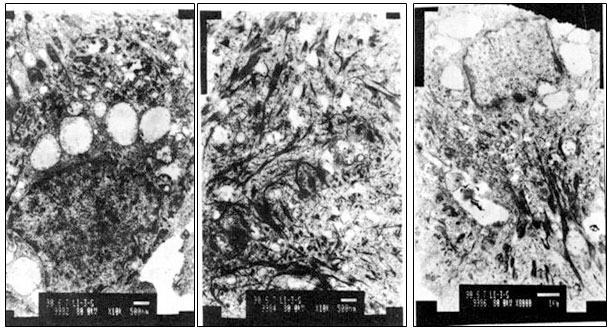 Fig.25.a (left). Before MEBO treatment, many circular vacuoles were present in the surrounding nucleus that showed irregular nuclear membrane with disappearance of nucleolus. TEM. 10,000.
