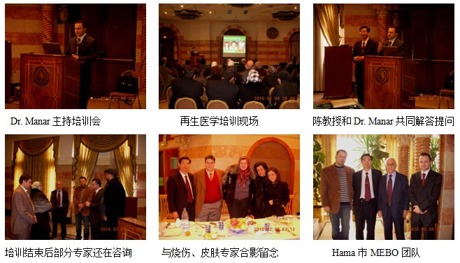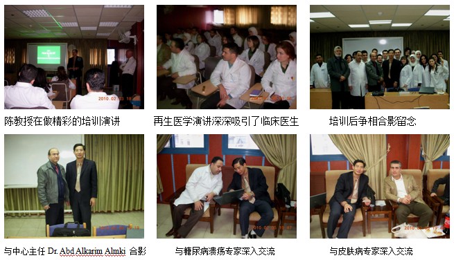 三、2010年2月3日中午,,,,,,陈教授应邀到卫生部Damascus Dermatology Medical Center(卫生部大马士革皮肤病医疗中心),,,,,,对该中心的皮肤科、糖尿病溃疡科和皮肤创伤科的30多名医师举行了再生医学手艺培训,,,,,,该中心的主任Dr. Abd Alkarim Almki 主持了培训聚会,,,,,,陈教授以“再生医学手艺增进皮肤损伤愈合的机理与临床应用”为题,,,,,,先容了再生医学在皮肤科和创疡领域的临床应用履历,,,,,,各人学得很是认真,,,,,,以为这次的培训为他们治疗种种皮肤疾病找到了更有用的要领。。。 。。再生医学培训在该院引起了很大的惊动和回声,,,,,,掀起了各人学习、应用再生医学手艺的热情和起劲性。。。 。。