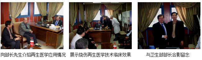 四、2010年2月3日下昼,,,,,,在卫生部隶属皮肤病医疗中心主任Dr. Abd Alkarim Almki的推荐和联系下,,,,,,陈教授一行约见了叙利亚卫生部部长Dr. Reda Saed。。。 。。在会见时代,,,,,,陈教授向卫生部部长先容了烧伤再生医学手艺的先进性、适用性和该手艺在中国和其它国家的临床应用情形以及取得的优异的临床治疗效果。。。 。。部长对烧伤再生医学手艺很是感兴趣,,,,,,希望以后有时机到中国举行实地旅行、考察。。。 。。这次能够约见叙利亚卫生部部长,,,,,,为烧伤再生医学手艺在叙利亚的学术、手艺周全推广争取政府的支持和资助做好了准备。。。 。。