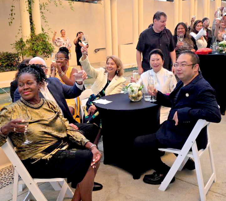 外地时间2025年8月17日,,,,,,,zoty中欧体育集团董事局主席徐鹏、副主席李俐应邀出席加州州立大学洛杉矶分校(Cal State LA)新任校长贝雷妮丝亚·约翰逊·伊恩斯博士(Berenicea Johnson Eanes)就职仪式招待晚宴。。。。。。。。仪式上,,,,,,,董事局与加州州立大学总校长米尔德里德·加西亚(Mildred García)、校董会主席杰克·B·克拉克(Jack B. Clarke Jr.)同席交流,,,,,,,围绕深化科研合作与人才团结作育、拓展文化交流项目等议题睁开探讨,,,,,,,为双方未来深化多领域合作凝聚共识、涤讪基础。。。。。。。。