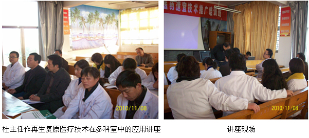 2010年11月8日下昼15:00,, ,, ,, ,中国中西医团结学会烧伤专业委员会常委、北京zoty中欧体育烧伤创疡研究所临床部研究员杜福勤教授和学会驻江苏省苏北区服务处刘恒主任应阜宁县东沟镇中心医院周建峰院长的约请,, ,, ,, ,为该院外科、肛肠科、妇产科、皮肤科等科室的主任、医护职员20余人作了“再生回复医疗手艺在多科室应用的学术讲座”,, ,, ,, ,该院外科陈为斌主任主持了讲座,, ,, ,, ,杜教授在授课中使用大宗的临床图片资料向各人先容了再生回复医疗手艺在外科、骨科、肛肠科、妇产科、皮肤科中的顺应症及治疗要领和愈后效果 。。。。。。 。该院向导及与会职员对再生医疗手艺优异的治疗效果给予了一定,, ,, ,, ,并提出了在临床应用该项手艺时所遇到的问题,, ,, ,, ,获得了杜教授耐心地解答 。。。。。。 。