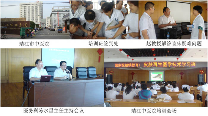 2012年8月17日,,, ,, ,应靖江中医院的约请,,, ,, ,北京烧伤创疡研究所赵瑞庆教授来到靖江中医院,,, ,, ,在该院医务科的起劲配合下乐成地举行了一期院级皮肤再生回复手艺培训班。。。。。。。加入培训的主要来自外科、痔瘘科、骨科、妇科、内科、急诊科的医务职员63人。。。。。。。赵教授培训时代,,, ,, ,代表北京烧伤创疡研究所向该院图书馆及有关科室赠予《再生回复手艺多科室应用汇编》30部。。。。。。。本次培训班由医务科陈水星主任主持。。。。。。。