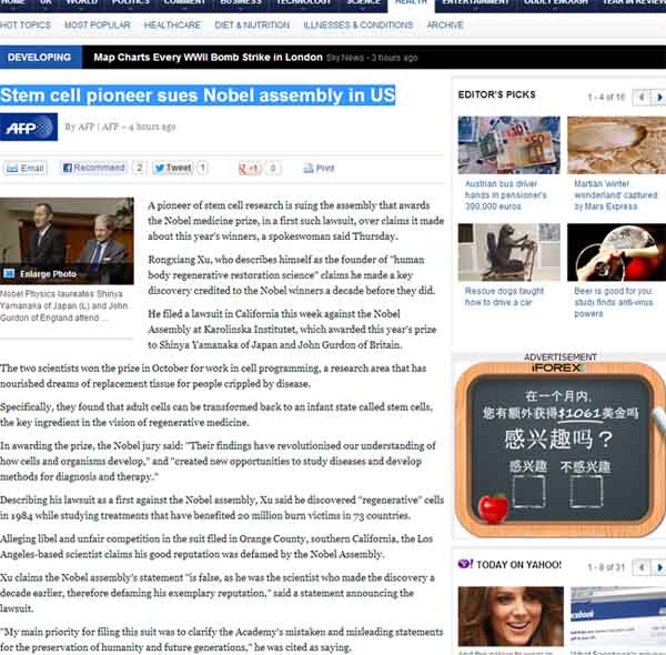 法新社:干细胞先驱美国状告诺贝尔奖委员会