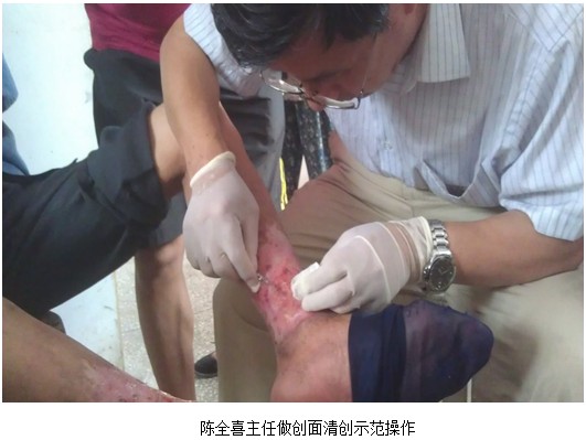 陈全喜主任树模换药,,,,, ,,并详细说明晰手艺操作要领。。。 。。。 。这次会诊使附院医生加深增强了对皮肤原位再生医疗手艺的熟悉,,,,, ,,为再外行艺早日为该区黎民所用打下了基础。。。 。。。 。