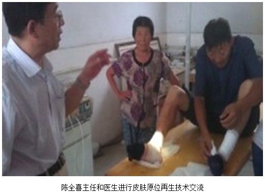 患者是一位年近七旬的老人,,,,, ,,三个月前做了下肢静脉曲张手术,,,,, ,,术后刀口不愈合。。。 。。。 。检查患者身体无糖尿病及其他并发症。。。 。。。 。陈主任会诊后,,,,, ,,和全科的四位医生配合视察创面并现场和医生举行了学术交流。。。 。。。 。陈全喜主任说,,,,, ,,创面已形成溃疡创面,,,,, ,,边沿隆起,,,,, ,,肉芽组织老化(纤维化)。。。 。。。 。这种难愈合性创面只有用皮肤原位再生医疗手艺来举行治疗,,,,, ,,才华在短时间内使创面愈合。。。 。。。 。陈主任说:“皮肤原位再生医疗手艺,,,,, ,,(体细胞诱导成干细胞,,,,, ,,在原位再生皮肤组织器官)能够提供细胞所需的营养因素,,,,, ,,并给创面创造一个优异的湿润情形,,,,, ,,从而激活了创面的潜能细胞转化为干细胞。。。 。。。 。在原位再生皮肤组织,,,,, ,,创面以心理性再生愈合。。。 。。。 。
