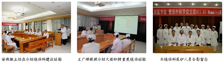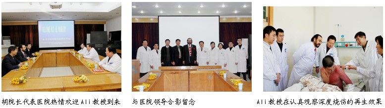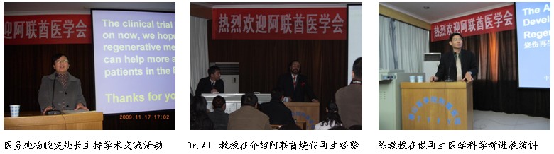 2009年11月11日至11月18日,,,,,,,阿拉伯团结酋长国(阿联酋)医师学会主席、整形外科学会主席、迪拜医学院硕士研究生导师Dr. Ali Al Numairy 教授应第37届北京国际微创外科大会和中国中西医团结学会烧伤专业委员会的约请,,,,,,,来到中国举行为期一周的再生医学学术演讲、履历交流和考察、学习大面积深度烧伤再生治疗的学术之旅。。。。。。。。在短短的一周时间里,,,,,,,Dr. Ali Al Numairy有幸再次见到了中国青年科学家、烧伤再生医学与人体生命再生科学的建设人徐荣祥教授,,,,,,,双方举行了普遍的再生科学领域的交流,,,,,,,还出席了在北京协和医院举行的2009年第37届北京国际微创外科大会,,,,,,,并在聚会上举行了烧伤湿润袒露疗法专题演讲,,,,,,,引起了全场惊动。。。。。。。。随后,,,,,,,Dr. Ali Al Numairy教授又赶到中国烧伤创疡泰山医院——泰山医学院隶属医院烧伤科,,,,,,,旅行考察大面积深度烧伤的皮肤再生治疗手艺并举行了深入的学术交流,,,,,,,整个行程内容富厚、精彩纷呈、收获颇丰!