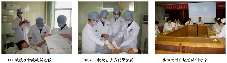 2009年11月16日下昼,,,,,,,Dr. Ali竣事了2009年北京国际微创外科大会的学术演讲后,,,,,,,便启程赶到了山东省泰安市,最先了对泰山医学院隶属医院的旅行、考察和学术交流之旅。。。。。。。。泰山医学院隶属医院对Dr.Ali的到来也很是重视,,,,,,,营业院长胡立功教授亲自组织安排了这次国际学术交流运动,,,,,,,医务处的杨晓雯处长则认真落实了各项详细的组织、策划、接待、协调以及做欢迎横幅、发通知等事情,,,,,,,而烧伤科主任徐西胜、王广顺教授和护士长公怌欣则发动全科医护职员起劲行动起来,,,,,,,做好迎接外洋专家来旅行考察和学术交流的各项准备事情,,,,,,,烧伤科里洋溢着节日气氛。。。。。。。。