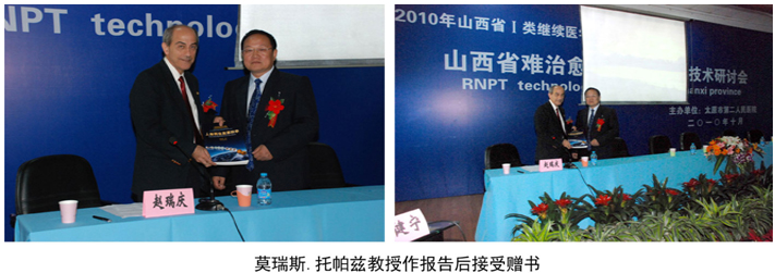 赵瑞庆教授在聚会时代代表中国中西医学会烧伤专业委员会向以色列创伤专家莫瑞斯•托帕兹在加入救治汶川大地动中受伤的小齐洋体现了衷心谢谢 ,,,, ,并赠予了《人体再生回复科学》专著一部。。。 。。。。