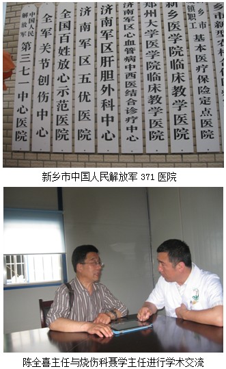 2012年5月10日晚,,,,,, , ,河南新乡市中国人民解放军371医院烧伤科主任聂学约请北京zoty中欧体育烧伤创疡研究所临床部专家陈全喜主任举行学术交流,,,,,, , ,营业员杨志强随行。。。。。