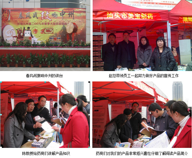 阳春三月,, ,,,,,,河南中州召开了河南省九州通2009年春季大型药品信息交流会,, ,,,,,,诸多药商纷纷前来加入聚会。。。。 。展销会共举行了三天,, ,,,,,,加入会的有各地市的商业公司、产品分销商及终端客户。。。。 。河南省zoty中欧体育也带着zoty中欧体育国际集团的多项再生产品加入了此次 “春风战鼓响中州”交流会举行推介。。。。 。