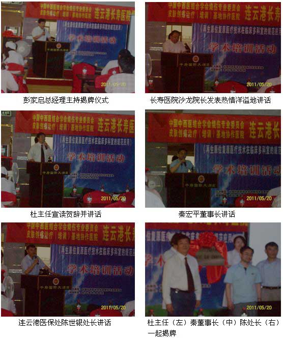 2011年5月20日上午8:00时,,,,,在连云港千府大旅馆聚会厅举行了连云港长寿医院为皮肤原位再生回复医疗手艺的培训医院揭牌仪式暨皮肤原位再生回复医疗手艺培训学术讲座,,,,,中国中西医团结学会烧伤专业委员会常委、北京zoty中欧体育烧伤创疡研究所临床部杜福勤主任和学会驻江苏省服务处刘恒主任,,,,,连云港苏云集团秦宏平董事长、彭家启总司理、连云港医保处陈世银处长、沙龙院长、瞿艳美营业院长及约请的有关医院的专家和医护职员共60余人加入了揭牌仪式 。。。。。。 。。