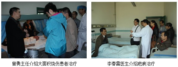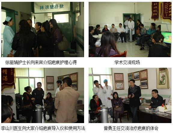 应四川省多家医院的申请,,,,,,四川省中西医团结学会烧伤专业委员会组织了一次重点关于疤痕治疗的学术观摩运动。。。。。。。 。2011年10月28日,,,,,,成都大学隶属医院自贡市第一人民医院自贡市第四人民医院及泸州市石油医院等多家单位近20人在学会邱卫东秘书的向导下来到了阿坝州林业中心医院旅行交流。。。。。。。 。阿坝州林业中心医院烧伤整形科曾勇主任代表医院热情的接待了各人。。。。。。。 。他简要地先容了医院正在举行灾后重修和科室现在应用再生医疗手艺的情形,,,,,,并且就烧伤、创疡、疤痕的治疗要领、要点和心得做了先容,,,,,,同时向各人展示了许多治愈患者的照片。。。。。。。 。接着曾主任向导各人到病房观摩,,,,,,针对各患者的治疗情形和治疗要领做了现场先容,,,,,,并且就旅行职员提出的疑问逐一的做了详细解答。。。。。。。 。观摩竣事后,,,,,,曾主任在科室办公室团结患者治疗情形详细向各人先容了自己使用再生医疗手艺的心得,,,,,,同时还将科室新引进的疤痕导入仪向各人做了展示和先容,,,,,,并且安排主管医生为各人演示和树模治疗操作要领。。。。。。。 。
