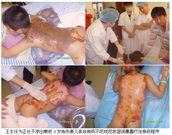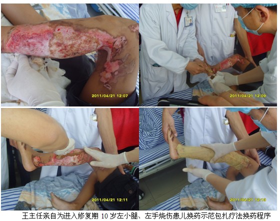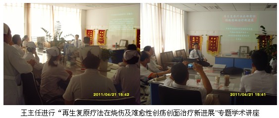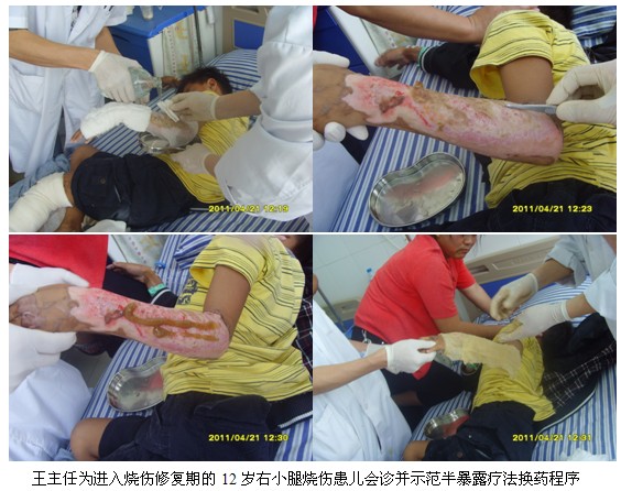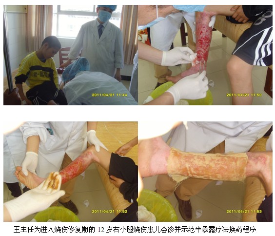 4月21日上午9时,,,,,,王洪生主任应邀到该院该院烧伤外科为正在住院的多名烧伤创疡患者会诊,,,,,,并亲自为多名患者换药,,,,,,树模差别深度烧伤及差别时期烧伤创面规范的处置惩罚要领。。。。。。。整个临床示教及会诊一直一连到当日近12时才竣事。。。。。。。当日下昼14:30分,,,,,,王主任应邀再次到该医院烧伤外科聚会室为两个外科的医护职员举行“再生回复疗法在烧伤及难治性创疡创面治疗的新希望”专题学术讲座。。。。。。。