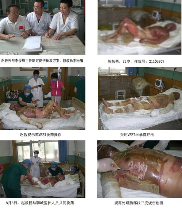 简讯1:8月6日,,,,,应山东聊城中医院外科约请,,,,,赵瑞庆教授第一时间赶到该院,,,,,指导使用MEBT手艺抢救了一例烧伤面积72﹪TBSA的酒精烧伤病人,,,,,与该院外科医务职员配合制订抢救计划,,,,,亲自树模再外行艺操作换药,,,,,规范浅易烧伤病房管理。。。。。。