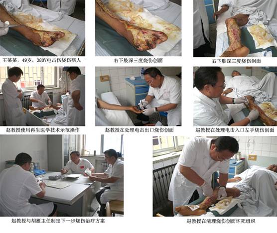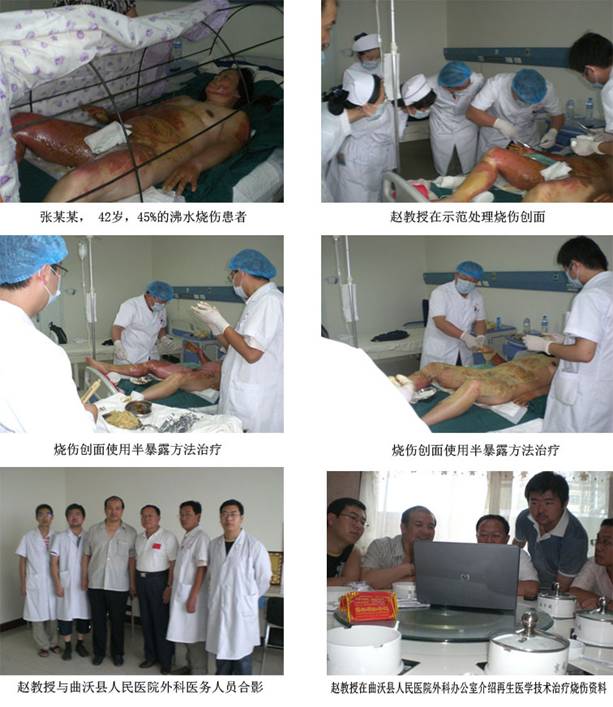 进入盛夏的8月份,,,,,北京烧伤创疡疡研究所副所长赵瑞庆教授应山东聊城中医院、山东牟平人民医院、山西襄汾县中医院、山西省曲沃县人民医院、山西省洪洞县中医院的约请,,,,,先后抢救了两例大面积烧伤患者,,,,,其中一例高压电电击烧伤患者,,,,,使用再生医学手艺取得了优异的临床治疗效果,,,,,同时,,,,,赵瑞庆教授还指导外地医院使用再生医学手艺治疗难愈合伤口也收到了知足的疗效。。。。。。