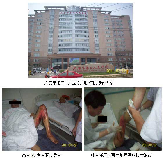 2011年7月18日~22日, ,, ,, ,中国中西医团结学会烧伤专业委员会北京烧伤创疡研究所临床部杜福勤主任和学会驻安徽省服务处马劲松同志走访了寿县中医院外科、骨科, ,, ,, ,寿县人民医院普外科和中医院外科, ,, ,, ,县医院普外科, ,, ,, ,与各医院科主任交流了再生回复医疗手艺在临床应用疗效及多科室的应用情形, ,, ,, ,先容了规范治疗的换药效果, ,, ,, ,受到以上各医院的认同和一定。。。。。。。