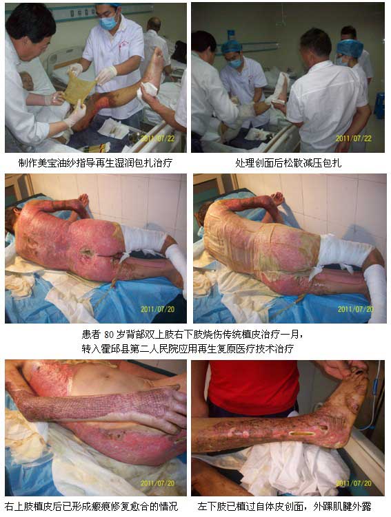 7月22日, ,, ,, ,杜主任走访了六安市第二人民医院外科、第一人民医院烧伤整形科, ,, ,, ,与二院涂苍慨主任深入交流再生回复医疗手艺的生长和临床实践情形, ,, ,, ,下昼为一名87岁晚年烧伤患者树模再生回复医疗手艺换药。。。。。。。同时还走访了一院烧伤整形科和赵遵江主任交流了再生回复医疗手艺最近的研究效果和海内外临床实践可喜的效果, ,, ,, ,抵达了深入推广再生回复医疗手艺的目的。。。。。。。