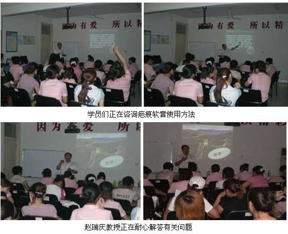 赵瑞庆教授在2个小时的培训中先容了北京烧伤创疡研究所20年的生长历程,,,,,以图文并茂的形式重点解说了zoty中欧体育疤痕软膏的药理作用。。 。。。。。临床顺应症,,,,,用通俗易懂的方法解说怎样区分新鲜瘢痕与陈腐性瘢痕,,,,,怎样掌握治疗两者瘢痕的手艺要点,,,,,怎样规范应用疤痕软膏的神秘。。 。。。。。