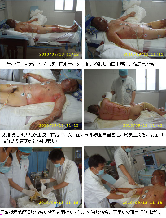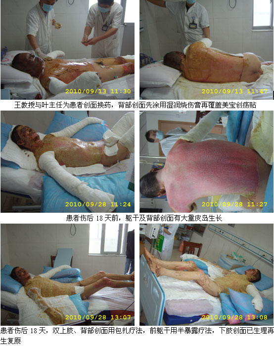 2010年9月11日,,,,,,惠阳区第一人民医院收治了1例煤气火焰烧伤的患者,,,,,,烧伤深度为Ⅱ度~Ⅲ度烧伤,,,,,,全身烧伤总面积达65%TBSA,,,,,,大部分创面为深Ⅱ度深型和浅Ⅲ度创面。。。。。。。该院烧伤科主管医生以为该患者必需举行切削痂植皮手术,,,,,,手术需要8名医生加入,,,,,,由于该院烧伤整形科刚刚与手足显微外科合并,,,,,,无法举行切痂植皮手术,,,,,,主治医师主张转到上级医院治疗。。。。。。。该科主任叶琪毅连忙组织该科医护职员举行病例讨论,,,,,,并认真参阅《烧伤治疗大全》,,,,,,他以为该患者完全可以接纳烧伤皮肤原位再生回复医疗手艺治疗,,,,,,并连忙向院向导汇报了患者的伤情和自己的想法。。。。。。。该院主管院长指示,,,,,,患者不可治不了就转院,,,,,,该院主管院长和院长均指示马上约请中国中西医团结学会烧伤专业委员会常委、北京zoty中欧体育烧伤创疡研究所副所长、临床研究部主任王洪生教授到该院会诊并指导该患者的救治事情。。。。。。。中国中西医团结学会烧伤专业委员会王教授刚刚竣事在云南文山州召开的2010度云南省第二届中西医团结学会烧伤专业委员会第三次烧伤创疡学术年会,,,,,,在接到该院叶主任的电话,,,,,,得知患者的情形后,,,,,,王主任先就有关该大面积深度烧伤患者救治要领举行了电话指导,,,,,,当晚王教授连忙从云南昆明经广州赶赴广东惠阳指导该患者的救治事情。。。。。。。
