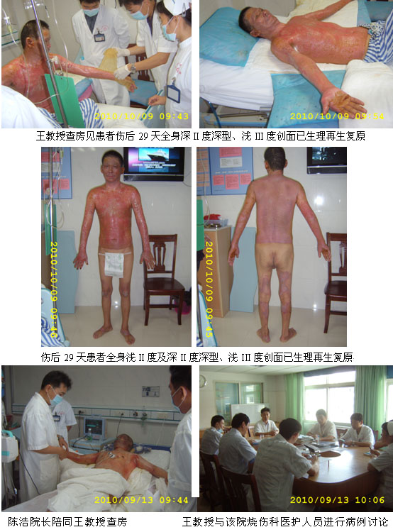 2010年10月9日,,,,,,对惠阳区第一人民医院烧伤整形手足显微外科和他们收治的这例大面积深度烧伤患者来说,,,,,,都是值得庆祝的日子,,,,,,经由该科医护职员30多个夜以继日的全心治疗,,,,,,该患者深度烧伤创面未举行切、削痂植皮,,,,,,全程应用烧伤皮肤原位再生回复手艺治疗创面,,,,,,实现了皮肤组织器官的原位再生回复,,,,,,阻止了残疾。。。。。。。当日上午9时,,,,,,王洪生教授再次来到惠阳区第一人民医院,,,,,,在该院陈浩院长以及烧伤手足显微外科叶琪毅主任陪同,,,,,,深入烧伤病房为患者查房,,,,,,指导医生对患者创面康复期的治疗,,,,,,并为刚刚收治的1例烧伤总面积达45%TBSA的深度烧伤患者举行了会诊和指导。。。。。。。