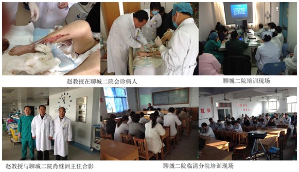 北京烧伤创疡研究所赵瑞庆教授应山东聊城人民医院、聊城第二人民医院的约请,, ,, ,,,于2012年11月11日-14日划分在聊城地区两所三级医院烧伤整形科举行了两期再生回复手艺的培训,, ,, ,,,着重解说了创面修复历程中再生回复手艺的焦点点,, ,, ,,,即网中网抗熏染理论、三隔离机理,, ,, ,,,详细讲述了创面液化物扫除体外无生命活力组织机理的历程。。 。 。。。。。培训竣事后,, ,, ,,,赵教授还会诊了三例难愈合创面的病人。。 。 。。。。。