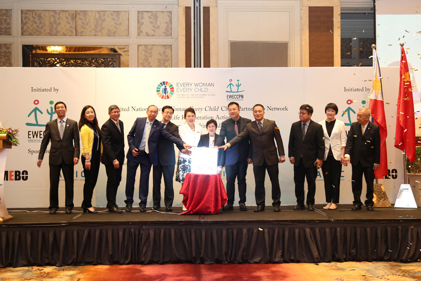 全体嘉宾走上主席台, ,,,,,,,配合为这一主要的时刻按下了启动按钮, ,,,,,,,标记着团结国“每个妇女 每个儿童”中国合作伙伴网络生命再生行动菲律宾项目正式启动!