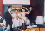 (1990年10月,,,,,,泰国卫生部长乃玛津汶(左一)在中国赴泰国烧伤医疗队救治乐成新闻宣布会上,,,,,,代表泰国向中国医生体现谢谢。。。。。。 。)
